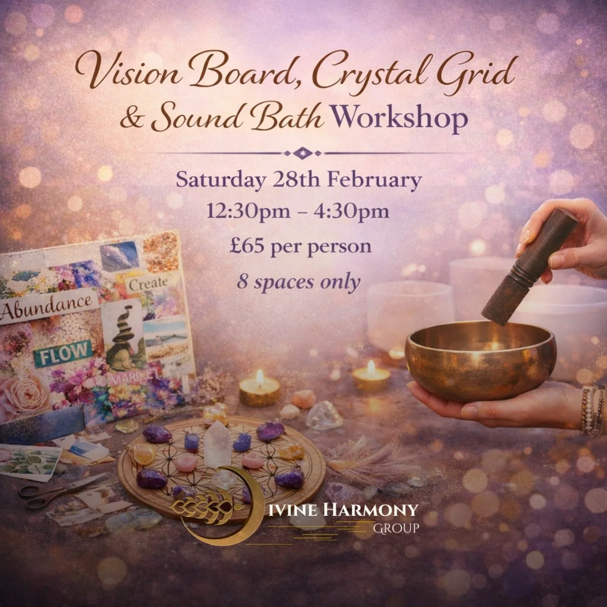 A creative and immersive workshop focused on abundance and intention, combining vision board creation, crystal grid work, and a heart-opening sound bath to support clarity, alignment, and receiving.